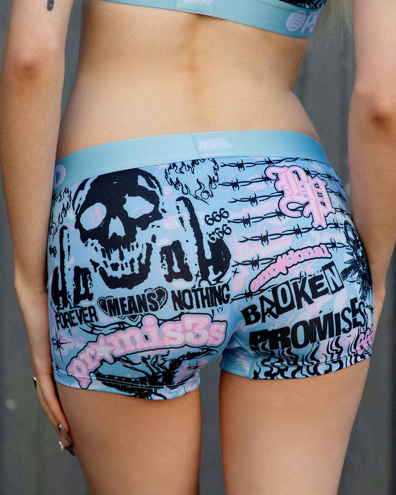 Gritty artwork, bold lettering, and a hit of emotional edge. This is Broken Promises x PSD in full force. The Forever Boy Short is made from a silky poly-blend with a comfortable, full-coverage, keep-you-in fit. The PSD boy shorts are perfect for everyday wear and working out.
