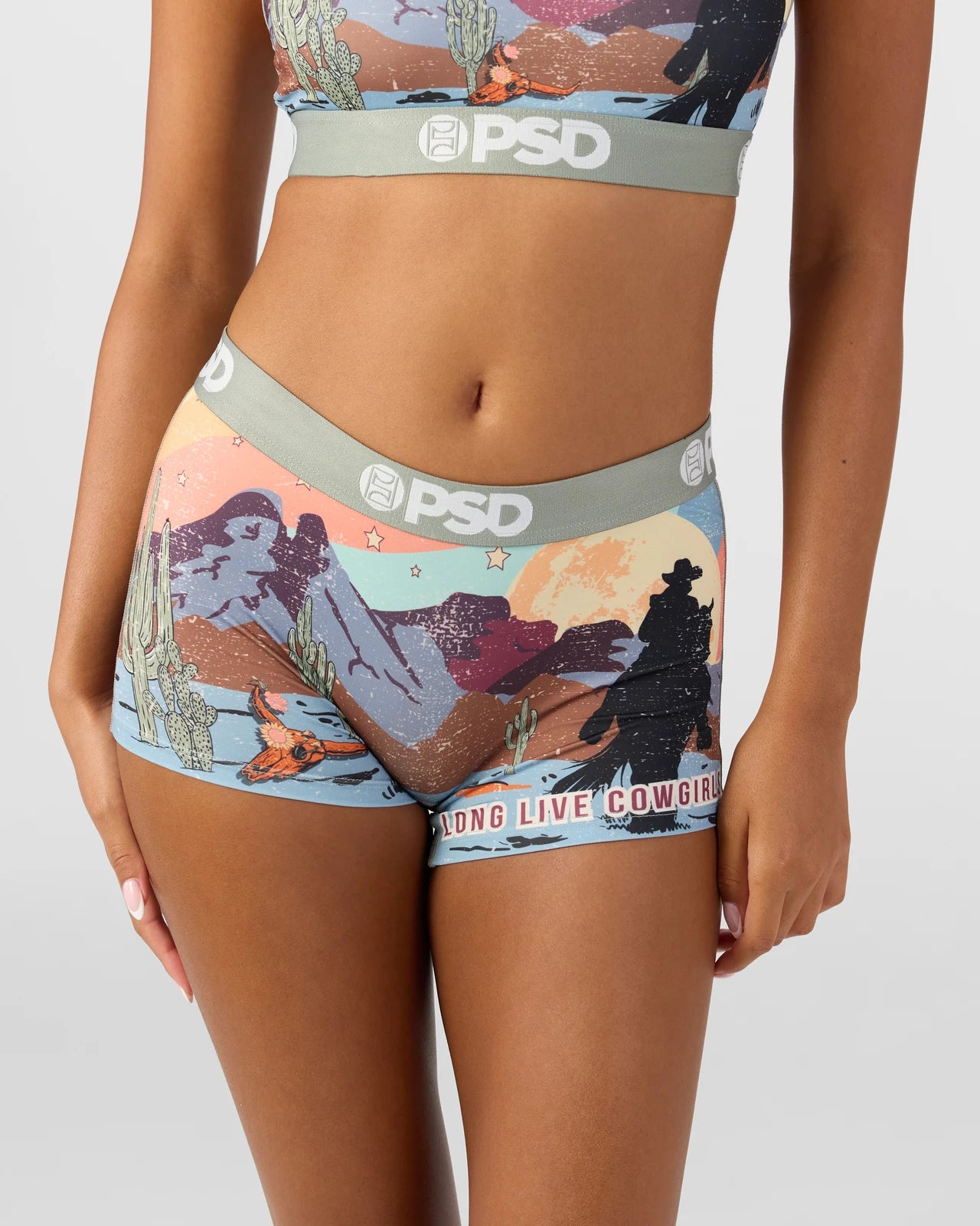 Live out your cowgirl fantasies and ride into the sunset in this new women’s look. The Desert Sunset Boy Short is made from a silky poly blend with a comfortable full-coverage, keep-you-in fit. The PSD boy shorts are perfect for everyday wear and working out.