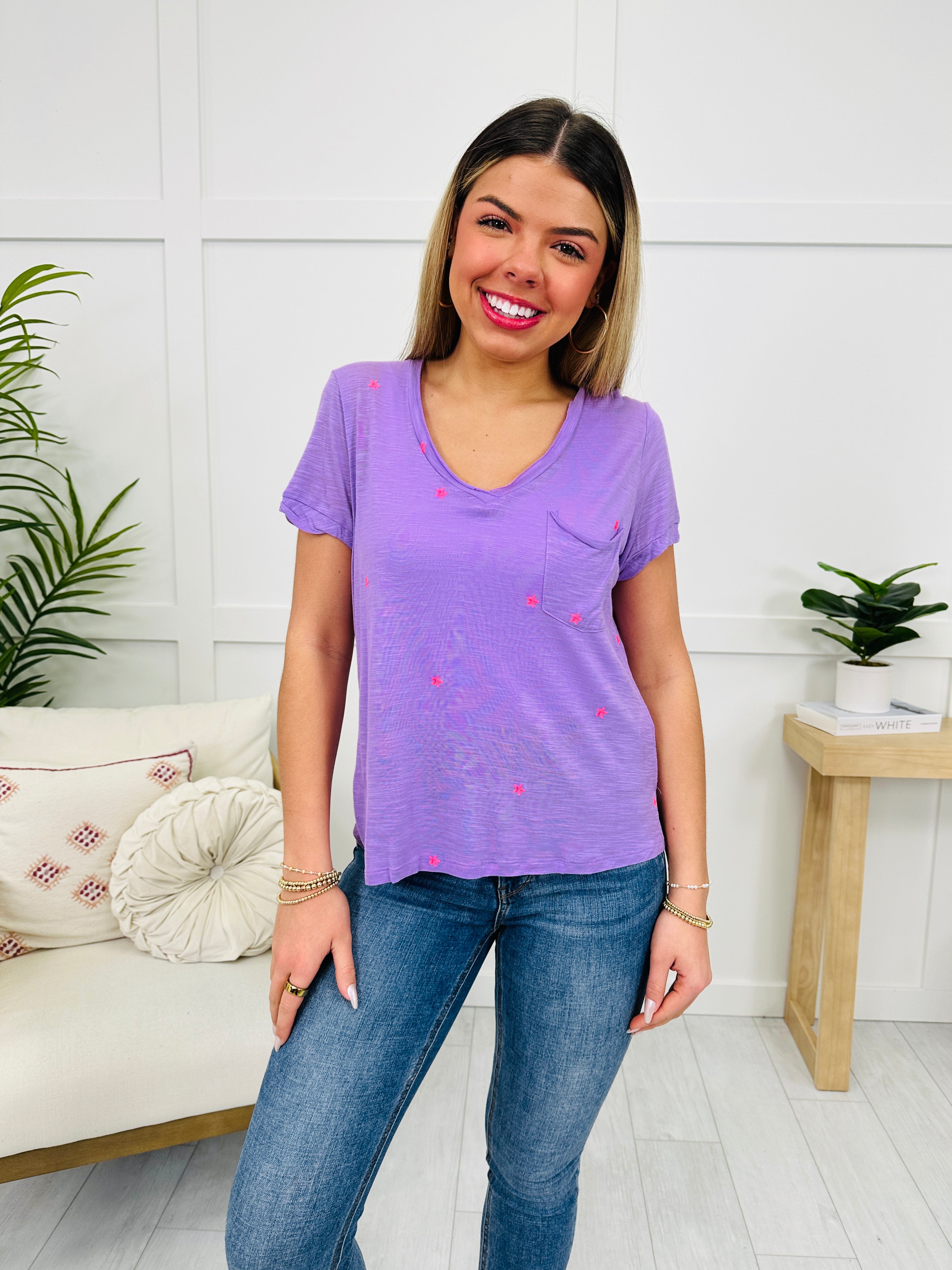 Add a pop of playful charm to your look with this lightweight lavender tee, sprinkled with tiny, bright pink embroidered stars. The relaxed fit, rolled sleeves, and chest pocket keep it effortlessly cool and casual.